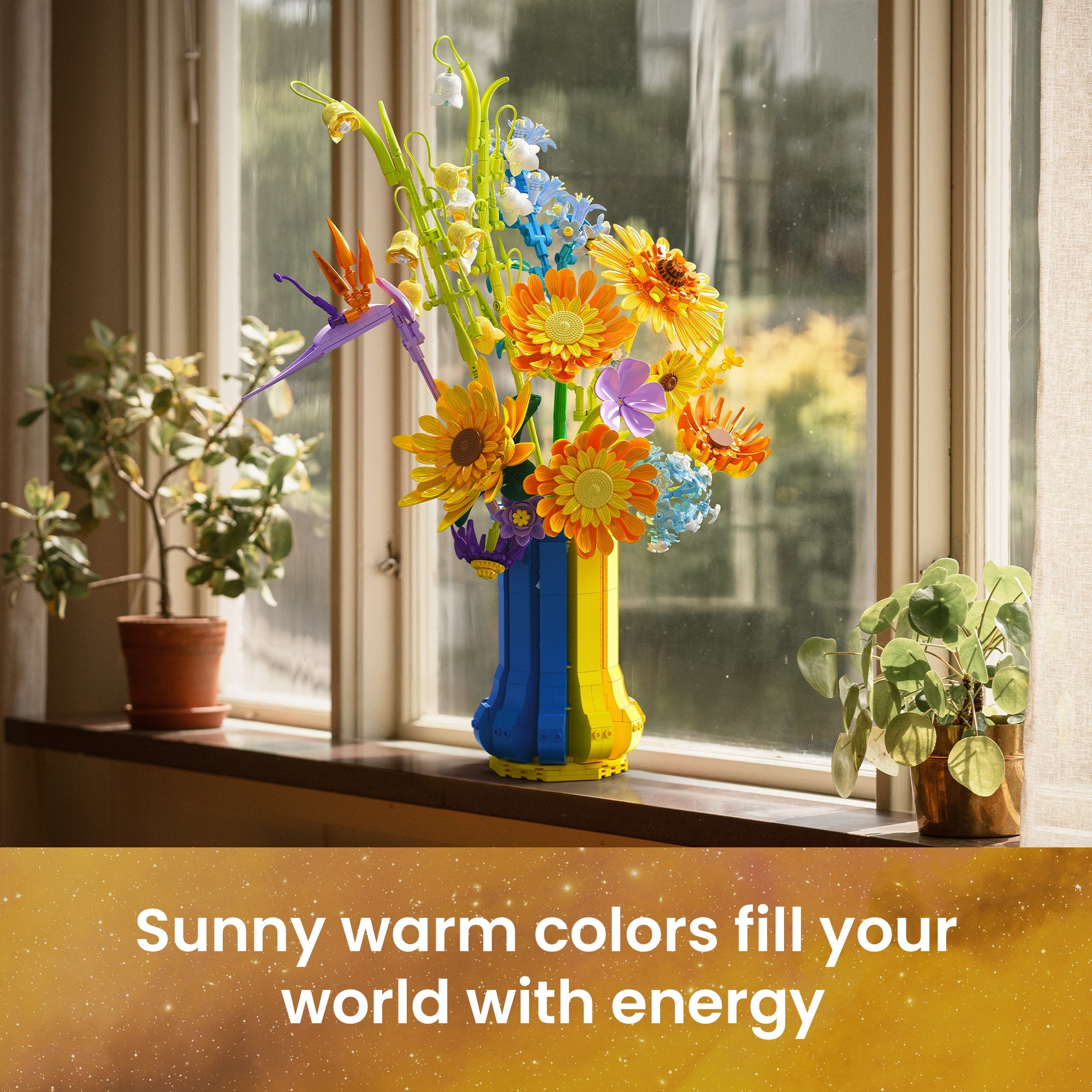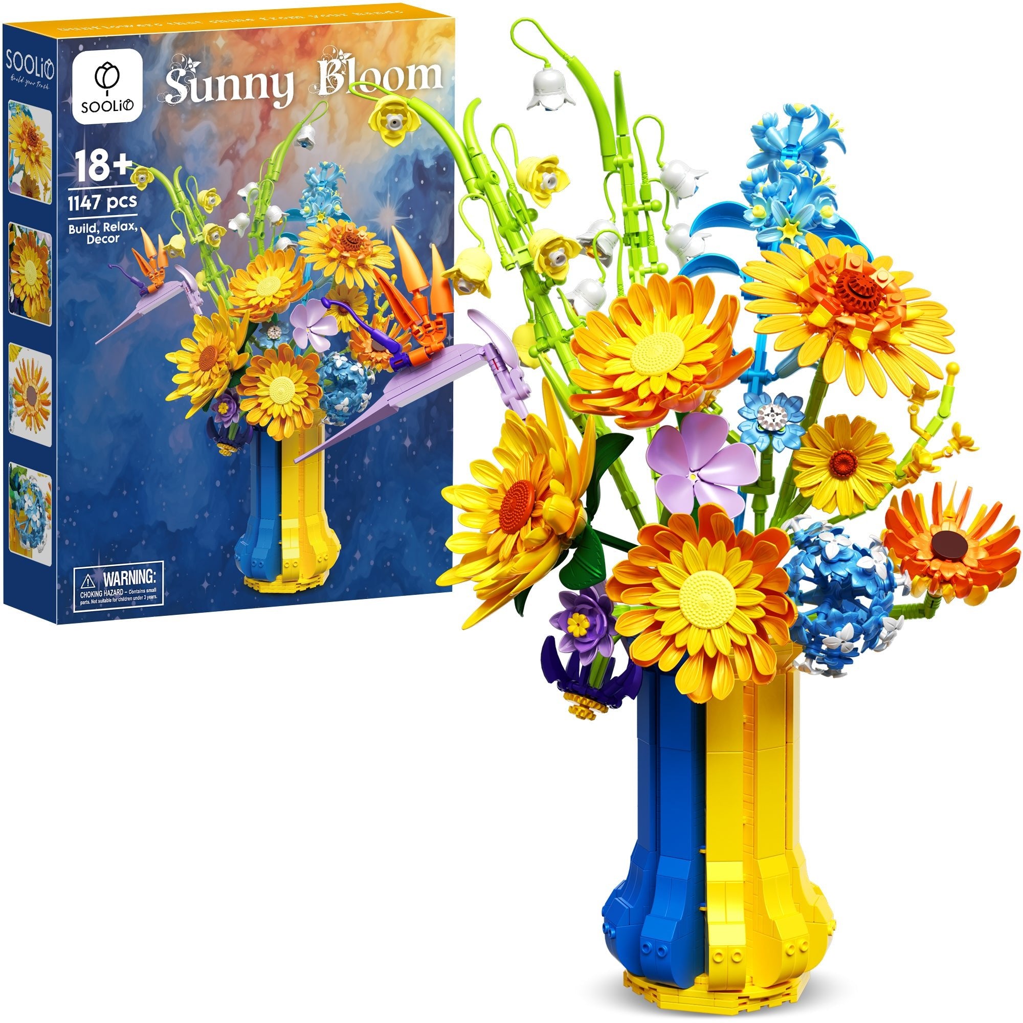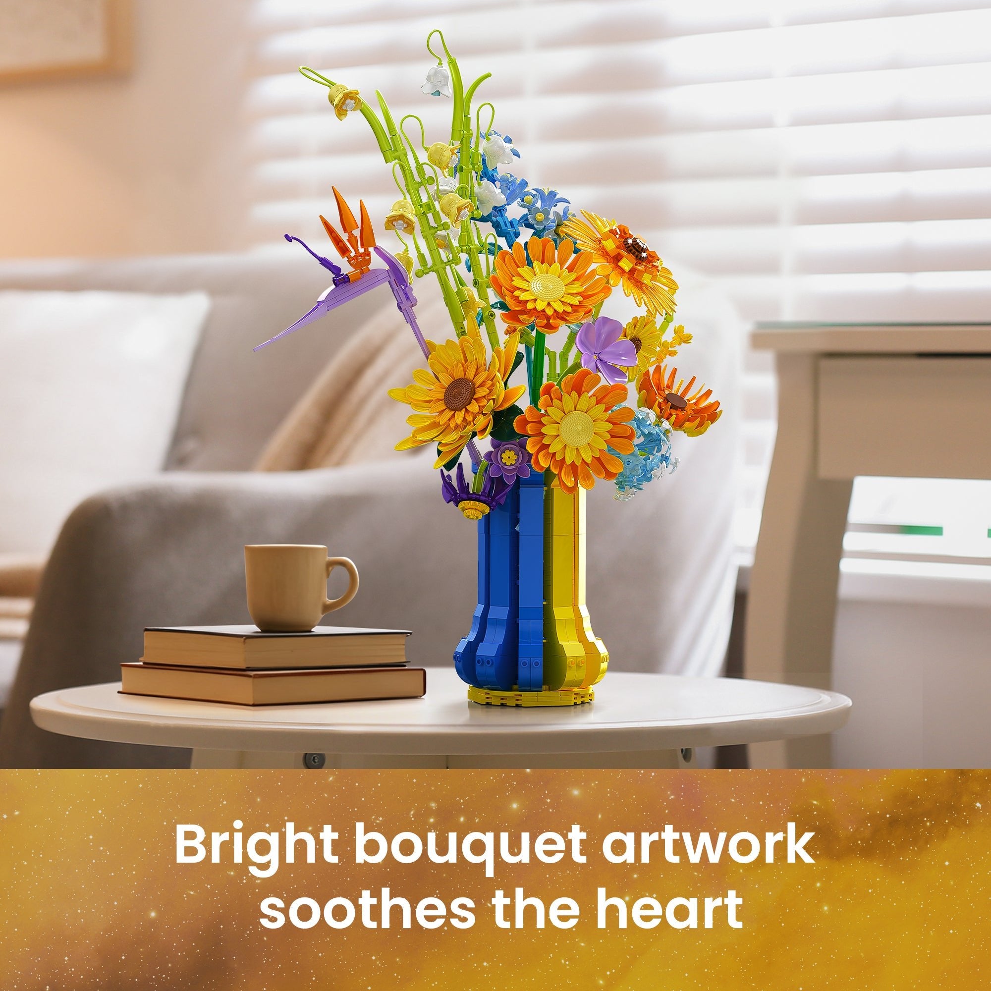 Color Quality, Realism, and Artistic Appeal: The colors are vibrant and high quality, with a perfect blend of warm yellows and oranges mixed with cool blues and purples. The sunflowers capture that happy, uplifting feeling they’re known for, and the additional flowers bring an elegant botanical variety. The bouquet has depth, dimension, and a realistic silhouette that resembles a hand crafted floral arrangement rather than a blocky toy. It’s both artistic and cheerful a perfect centerpiece for desks, shelves, or office décor.