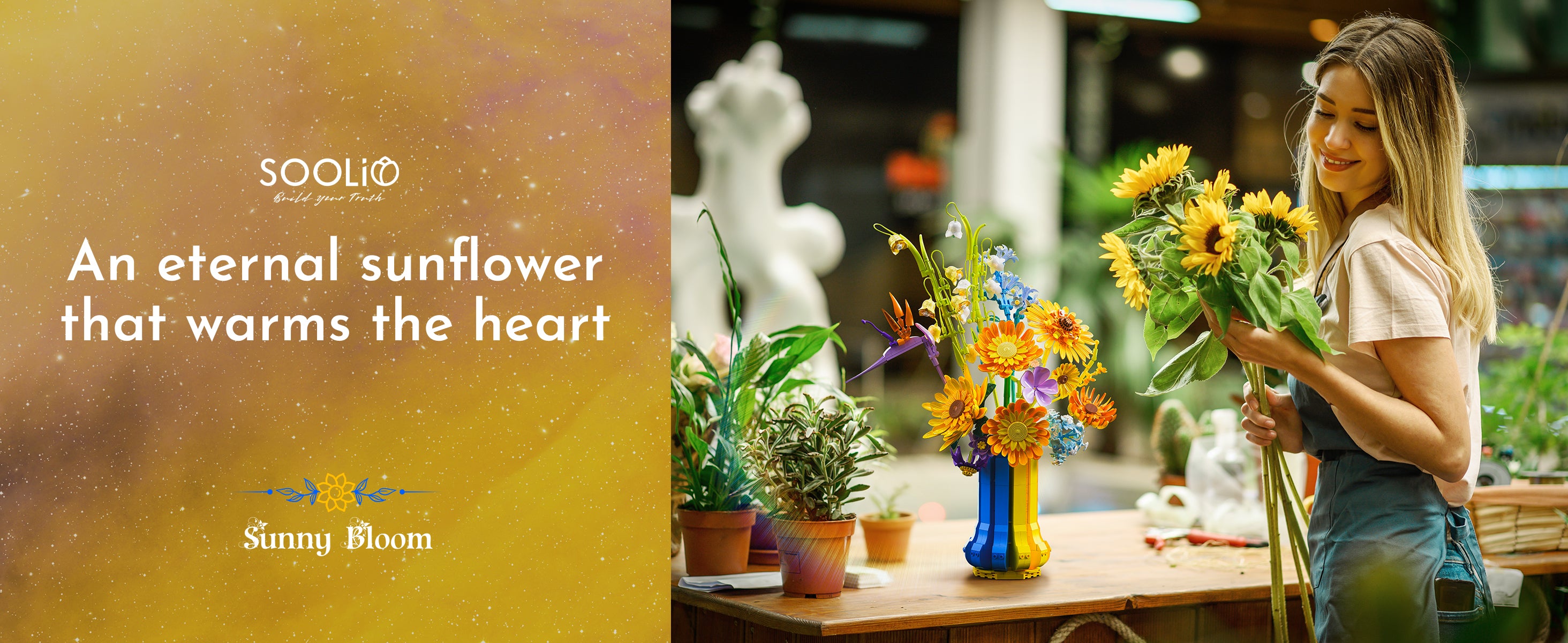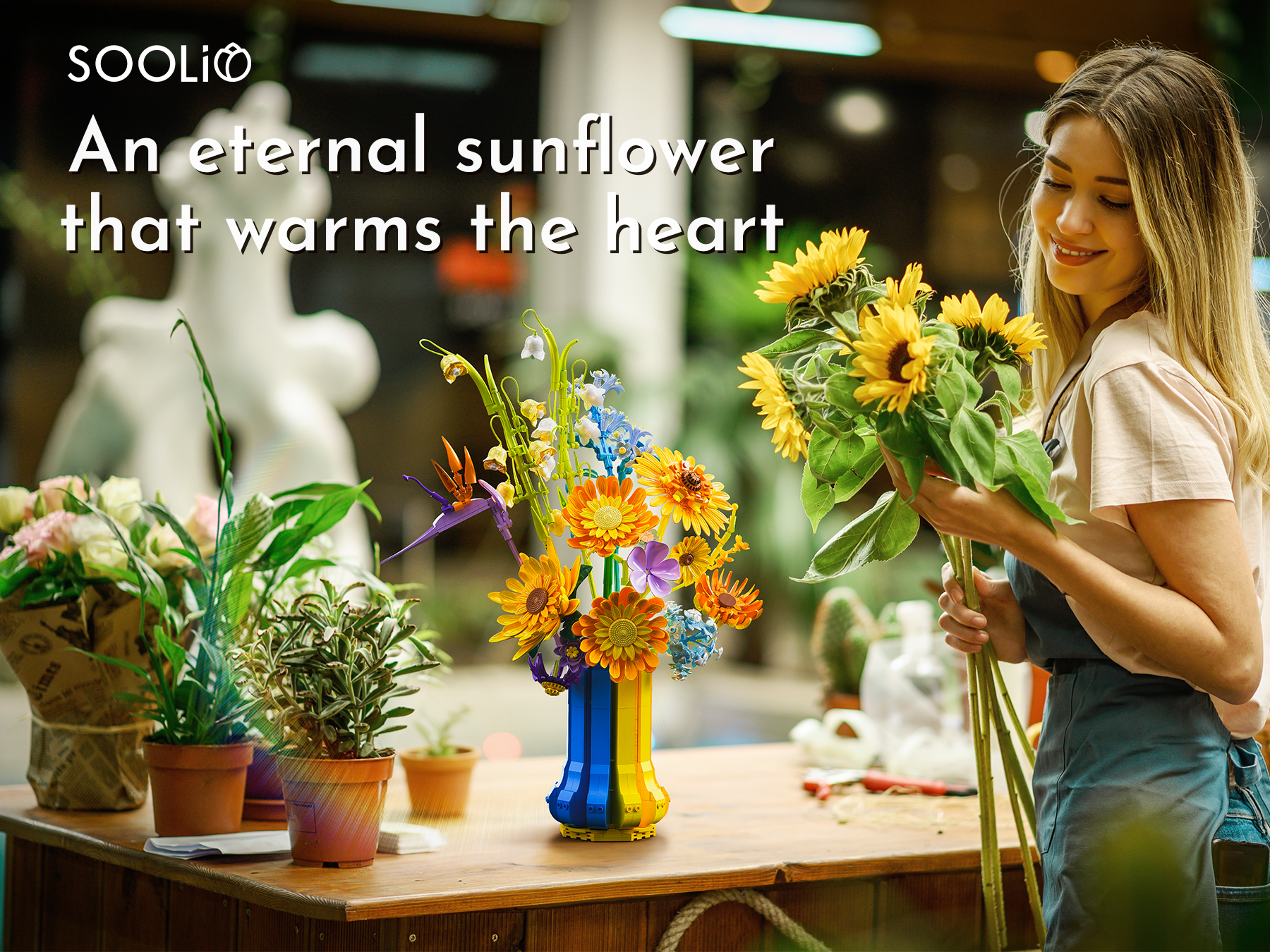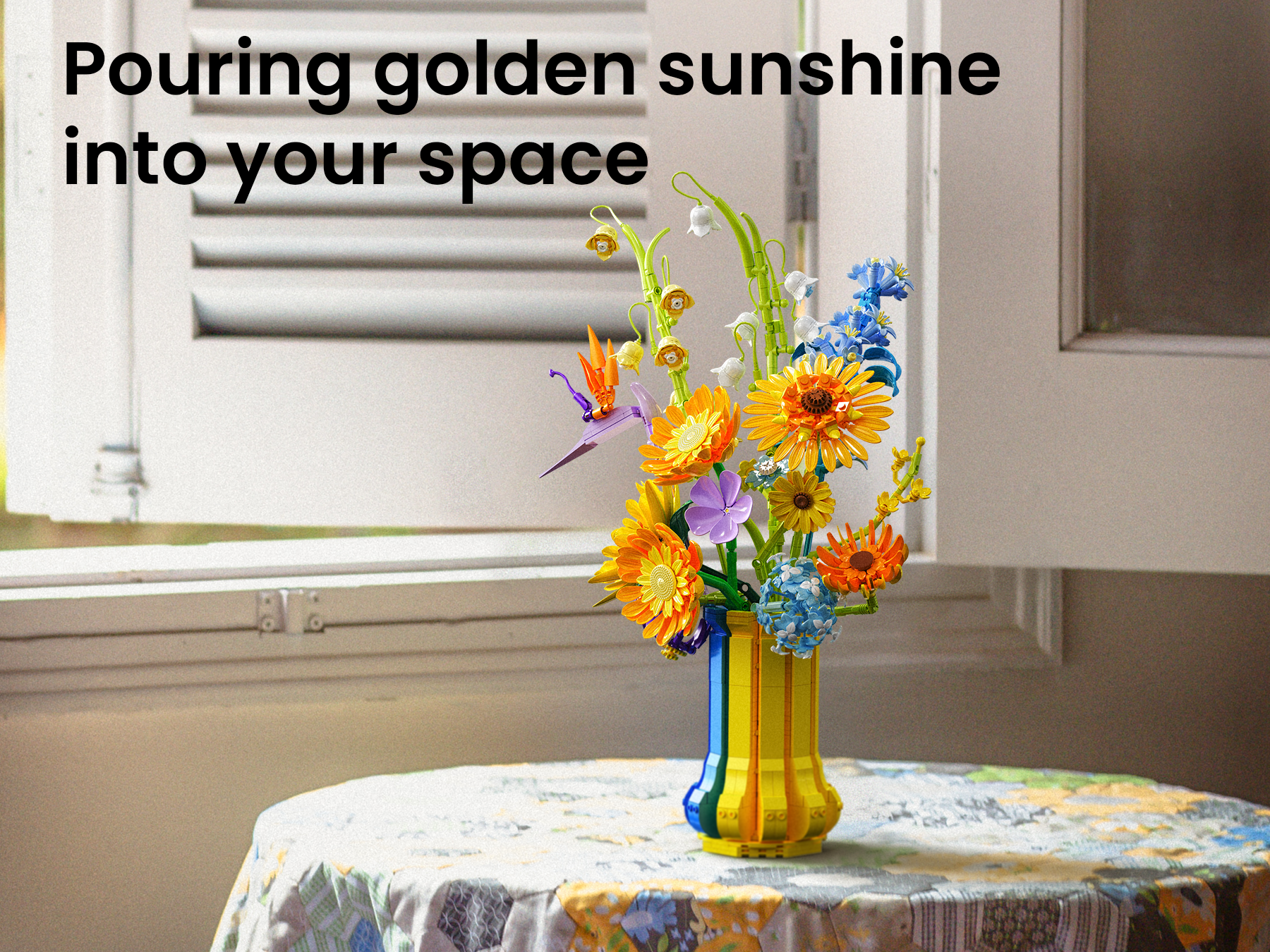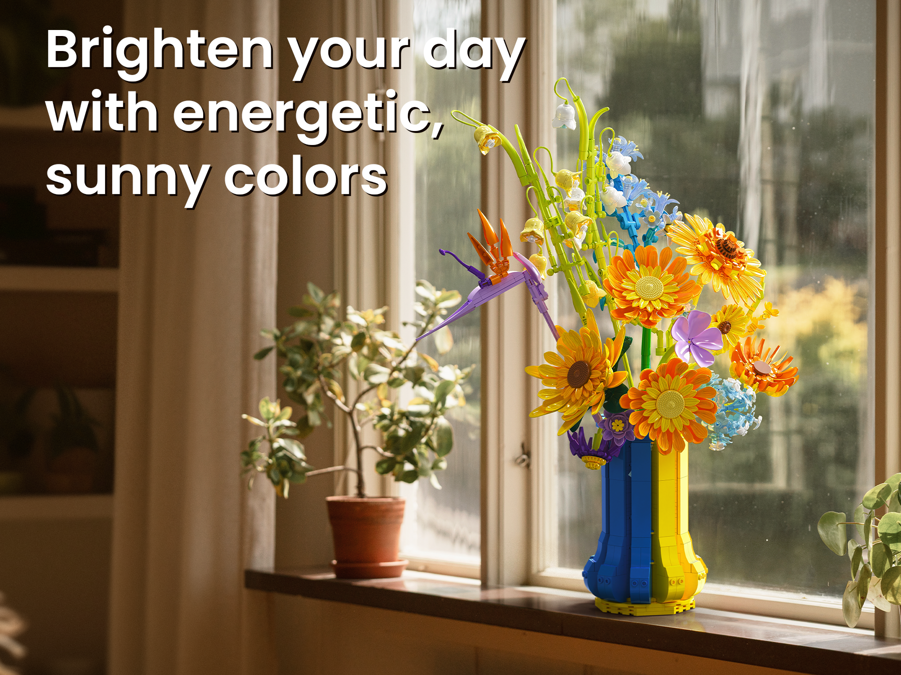 Color Quality, Realism, and Artistic Appeal: The colors are vibrant and high quality, with a perfect blend of warm yellows and oranges mixed with cool blues and purples. The sunflowers capture that happy, uplifting feeling they’re known for, and the additional flowers bring an elegant botanical variety. The bouquet has depth, dimension, and a realistic silhouette that resembles a hand crafted floral arrangement rather than a blocky toy. It’s both artistic and cheerful a perfect centerpiece for desks, shelves, or office décor.