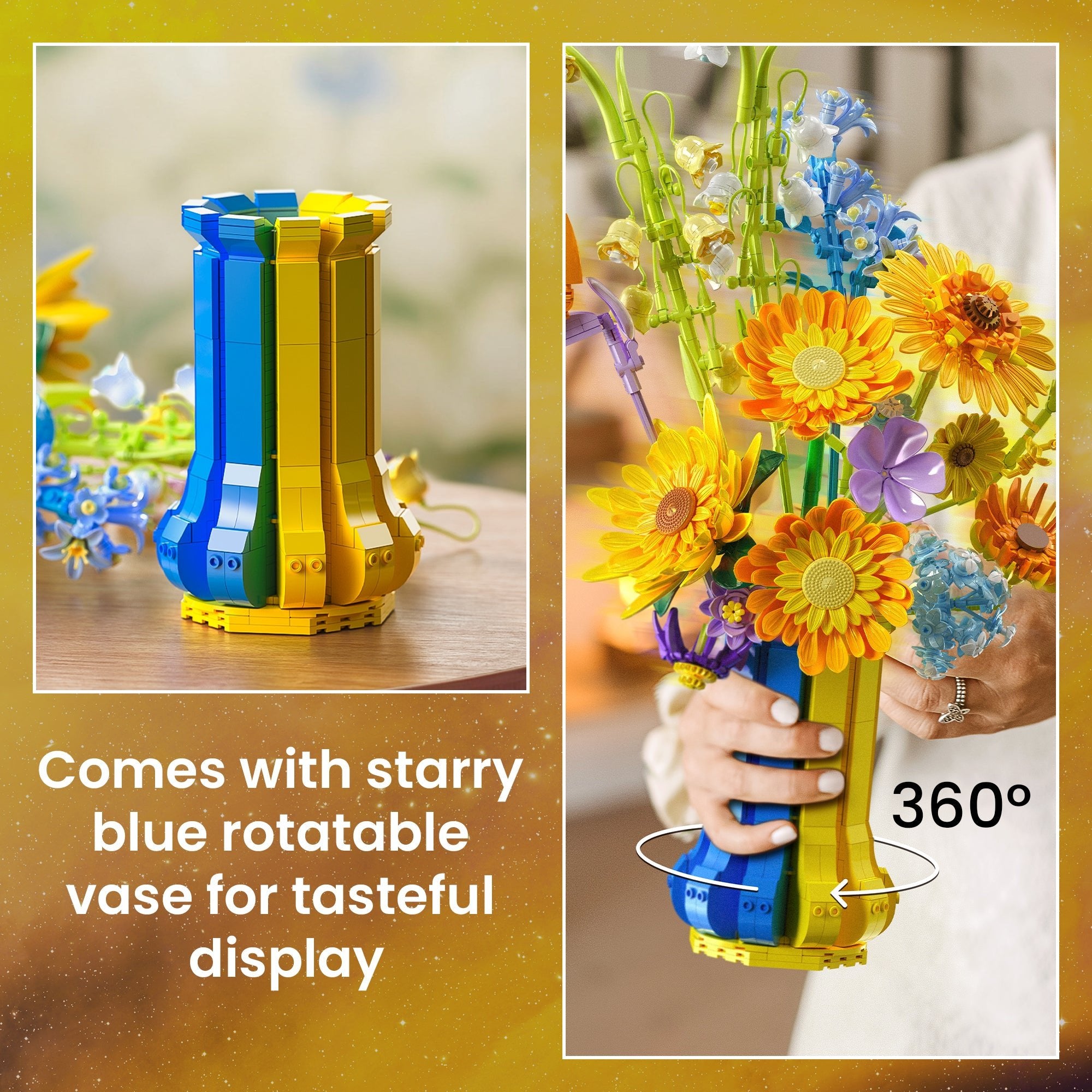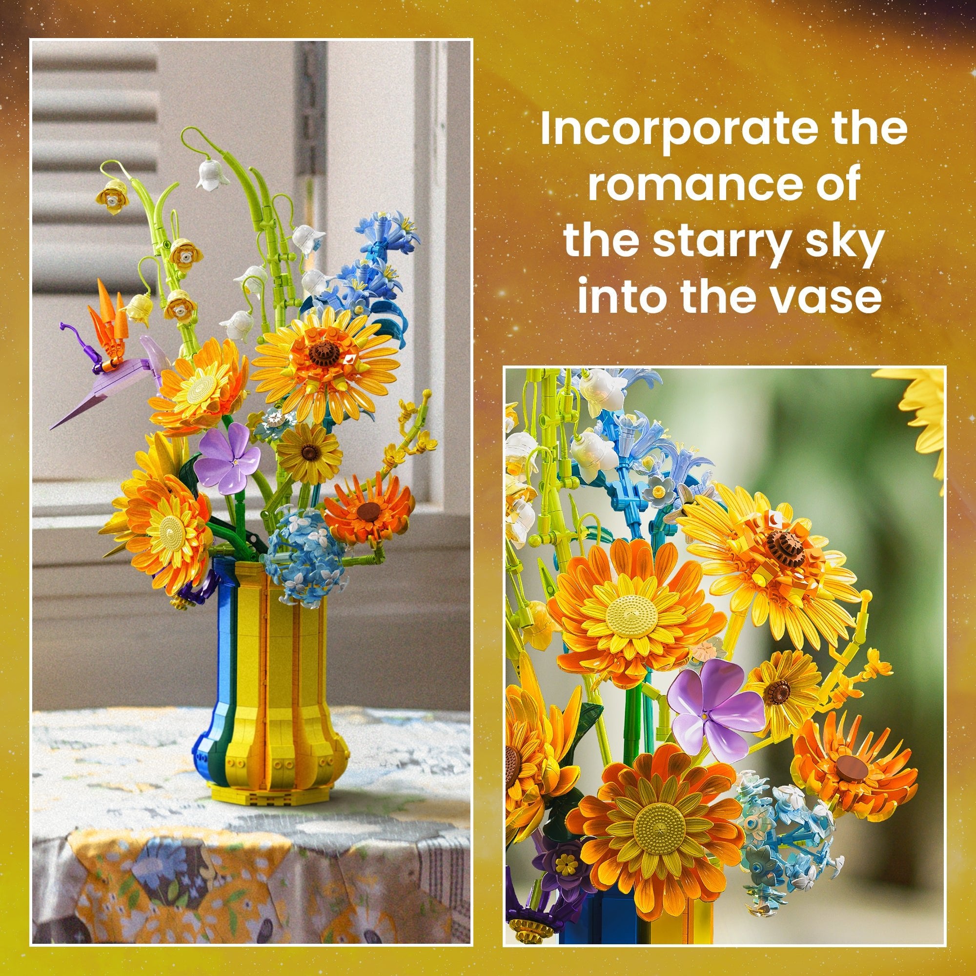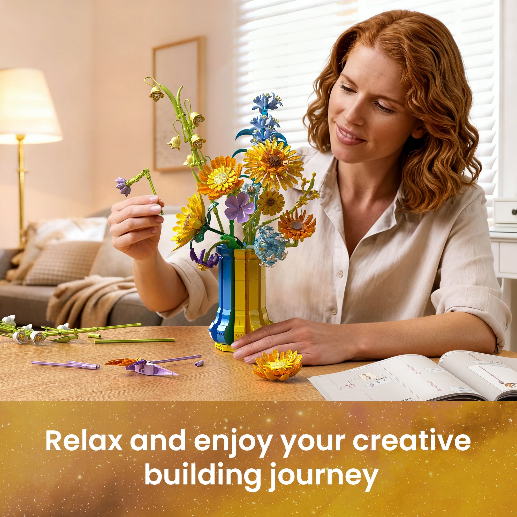 Long Term Use, Maintenance, and Decoration: Once built, the bouquet holds up perfectly over time. It doesn’t fade, loosen, or lose its shape. Dust brushes off easily, and the vase stays sturdy. It’s a beautiful permanent decoration that doesn’t wilt or require maintenance. Whether displayed alone or alongside other botanical sets, it adds a bright splash of color and happiness to the room.