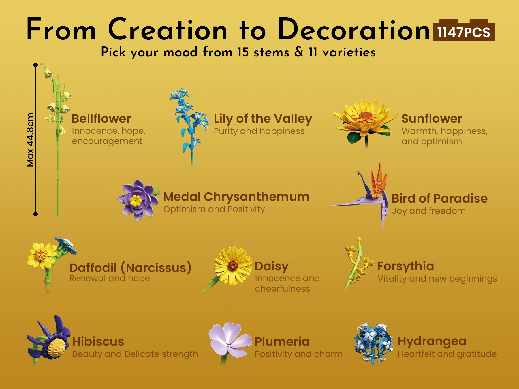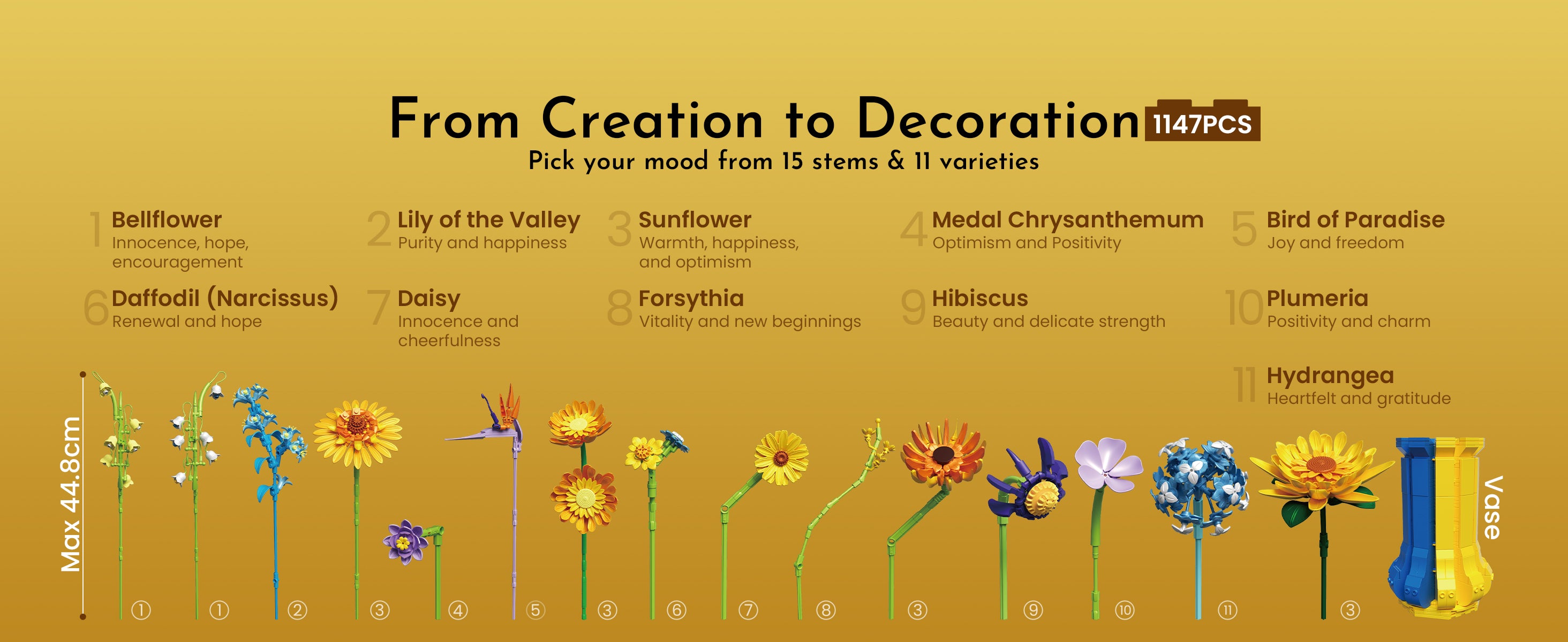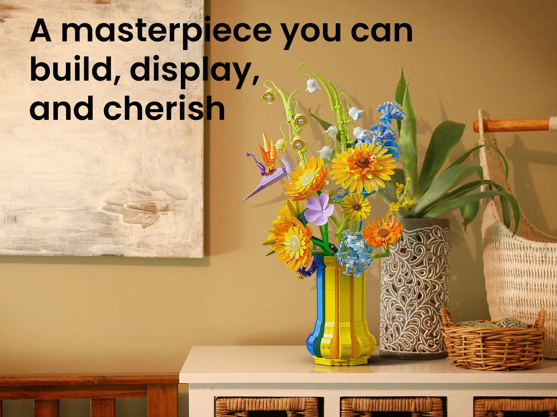 Long Term Use, Maintenance, and Decoration: Once built, the bouquet holds up perfectly over time. It doesn’t fade, loosen, or lose its shape. Dust brushes off easily, and the vase stays sturdy. It’s a beautiful permanent decoration that doesn’t wilt or require maintenance. Whether displayed alone or alongside other botanical sets, it adds a bright splash of color and happiness to the room.
